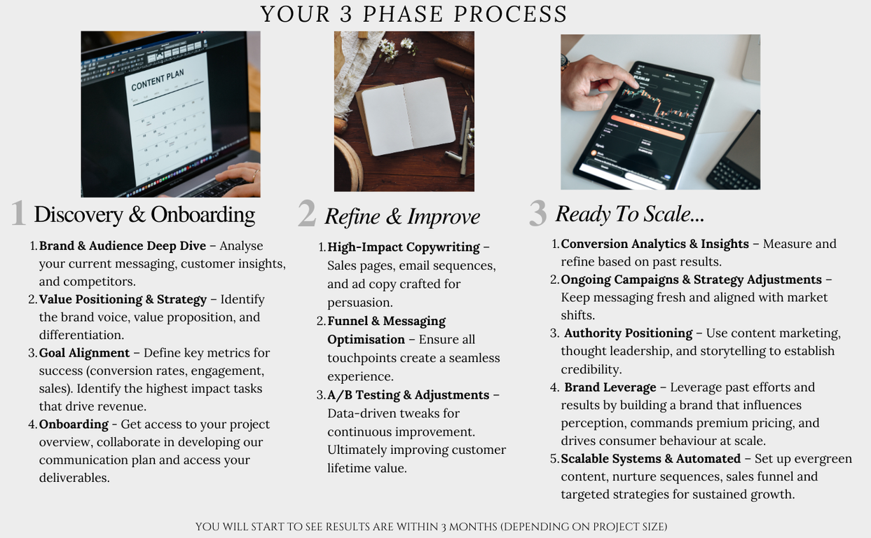 Copywriting without strategy can't be aligned with a specific goal or desired outcome. Making it hard to justify this investment and assess its value. This is why strategy is so important and a part of my process.